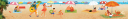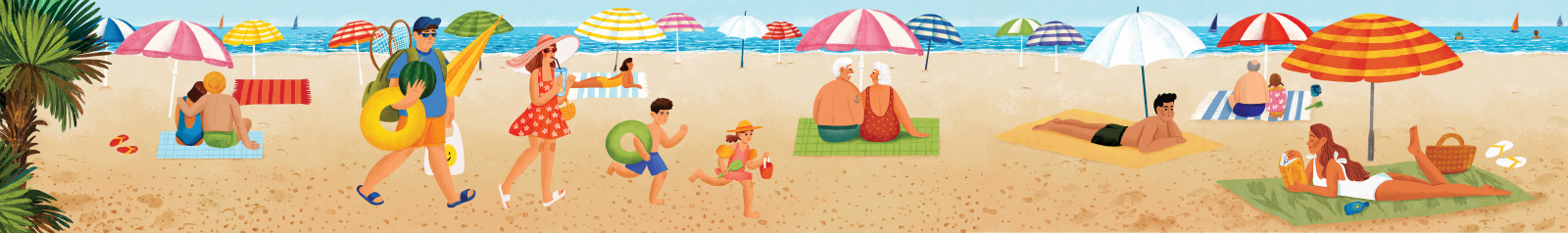 Сюжеты для иллюстраций появлялись постепенно. Сначала мы наметили общие темы, потом в процессе эскизирования появились разные детали. Я работала и с референсами, и с собственными наблюдениями и воспоминаниями о пляжном отдыхе. Некоторые забавные моменты появлялись в самом конце, например неравномерный загар одного персонажа — под футболку, шорты и носки.