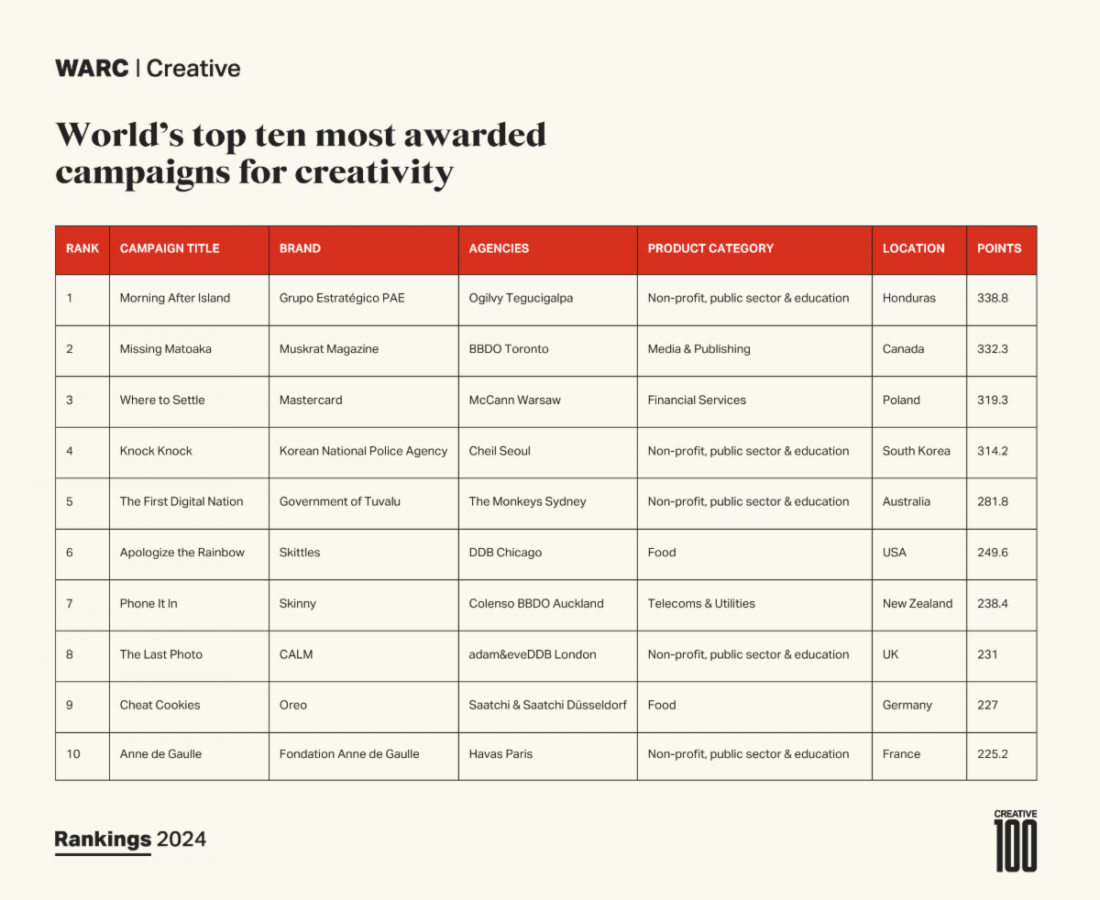 Всемирный центр исследования рекламы (The World Advertising Research Centre, WARC) представил ежегодный глобальный рейтинг Creative 100. Он отражает кампании, агентства, сети и бренды, получившие наибольшее количество наград на рекламных фестивалях.