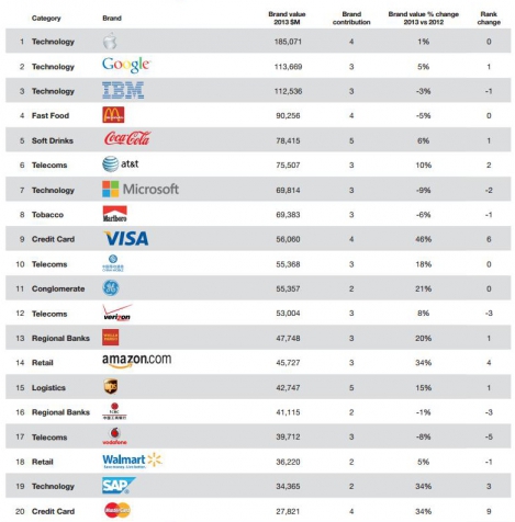 Который год подряд рейтинг возглавляют высокотехнологичные компании – Apple, Google и IBM. В течение последних трех лет лидером остается бренд из Купертино, несмотря на то, что рост его стоимости значительно замедлился: за последний год она выросла всего на 1%, в то время как в 2011 году бренд прибавил 84%, а в 2012 году – 19%. MBO оценила стоимость бренда в 185 млрд долларов. Компании Google удалось вернуться на вторую позицию, прибавив в стоимости 5% (до 113,7 млрд долларов), а вот стоимость IBM снизилась на 3% (до 112,5 млрд долларов).