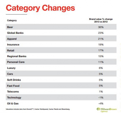 Самым бурнорастущим стал сегмент пива, прибавивший 36%. Только Brahma, бразильский бренд мирового лидера AB Inbev, увеличил стоимость на 61%. Рост в категории был достигнут благодаря увеличению продаж в Латинской Америке и Китае.