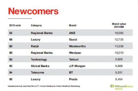 Среди новичков рейтинга – итальянские люксовые бренды Gucci и Prada, австралийские банки ANZ и Westpac, сеть супермаркетов Woolworths, банк JP Morgan, бренды Yahoo!, BT.