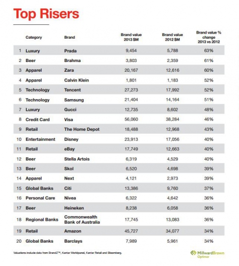 Свой вклад в рост брендов осуществили и развивающиеся рынки, подстегнувшие рост в отдельных категориях, особенно в luxury. В список самых быстрорастущих брендов вошел, к примеру, Prada, прибавивший к стоимости 63%. В настоящее время Prada занимает 4 место в категории люксовых брендов (и 95-е в общем рейтинге) с ценностью в 9,5 млрд долларов.