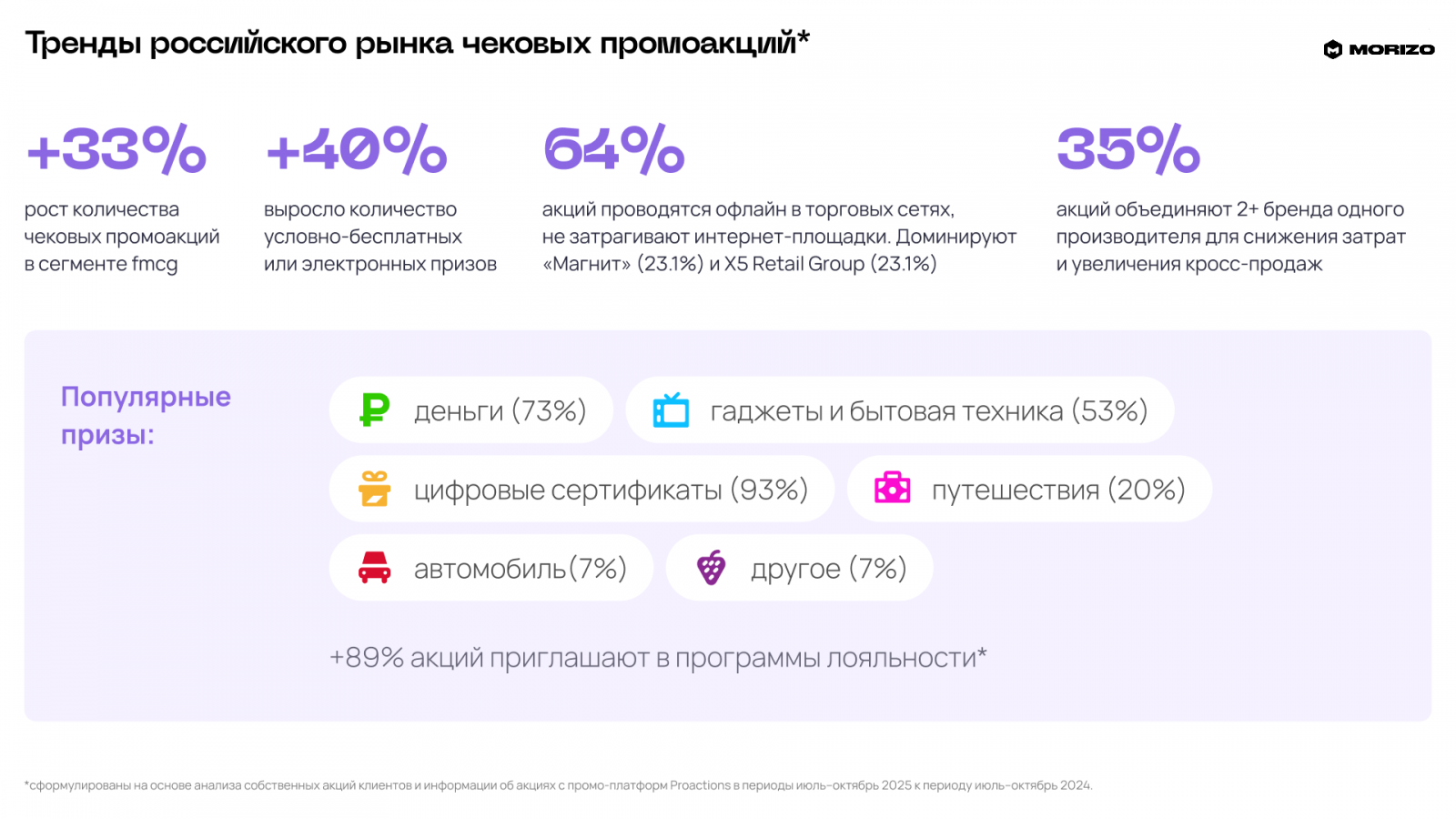 Рынок чековых промо в России вырос на 33% за год. Тренд связан с переходом к сберегательной модели потребления, росту конкуренции между брендами FMCG и необходимости дополнительно мотивировать покупателей на приобретение товаров. Авторы исследования проанализировали чековые промо сегмента FMCG за 2025 год в ценовом диапазоне от 50 до 1 900 руб. Стимулирующие механики, включенные в пул исследования, были реализованы в федеральных розничных сетях и на сайтах производителей.