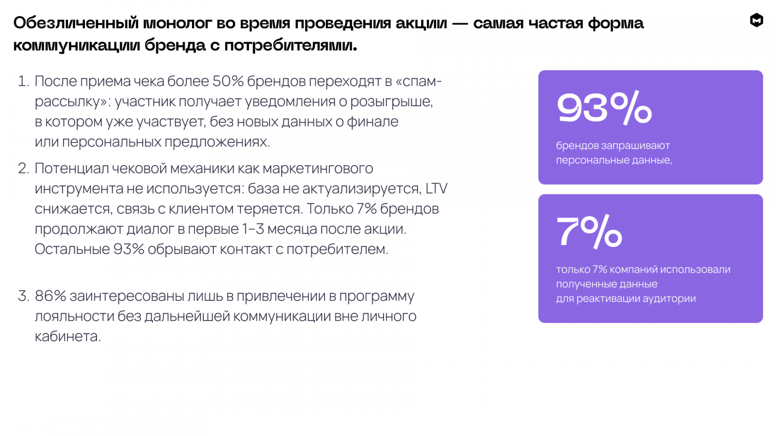 Исследование выявило отсутствие системной работы с данными: в 93% чековых промо бренды собирают информацию о покупателях, но коммуникация обрывает еще во время акции. Только 7% применяют собранные данные для реактивации аудитории и персонализированных предложений во время и после завершения кампании. Ключевая стратегическая ошибка — рассматривать чековые промо как краткосрочный инструмент стимулирования продаж. По мнению аналитиков, для роста LTV важно перевести клиентский опыт на персонализированную основу, прогнозировать спрос через анализ содержимого чеков и данных о покупателях. Использование CDP-платформ и запуск триггерной коммуникации напрямую стимулирует повторные покупки и снижает отток клиентов.