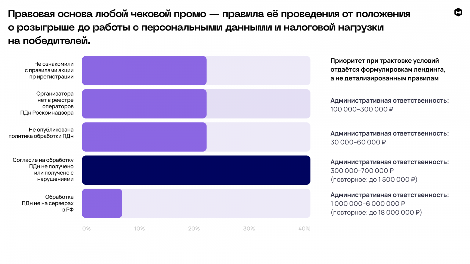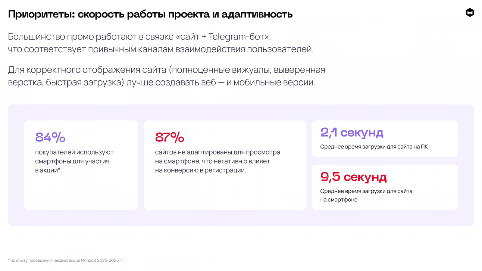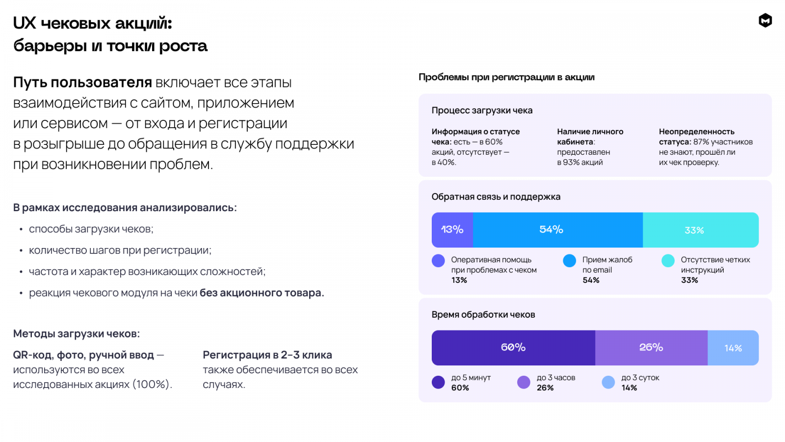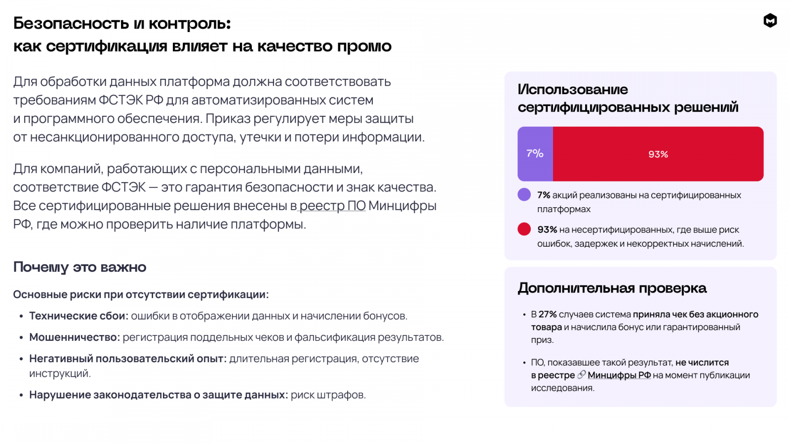 Аналитика показала, что техническая реализация чековых промо часто не соответствует ожиданиям клиентов: до 87% промосайтов не адаптированы под мобильные устройства, хотя 84% пользователей заходят в интернет со смартфонов. Если время загрузки сайта превышает 3,5 секунды, конверсия участия снижается со скоростью до 3% в секунду. При этом по данным исследования 27% ложных чеков успешно прошли валидацию из-за недостаточной защиты систем обработки данных. В результате компани награждают за покупки, которых не было. Решить проблему можно использованием сертифицированных платформ. Суммарно, все базовые ошибки могут снизить результативность промо как маркетингового инструмента на 80%, их исправление, по опыту авторов исследования, занимает около одного — двух месяцев.
