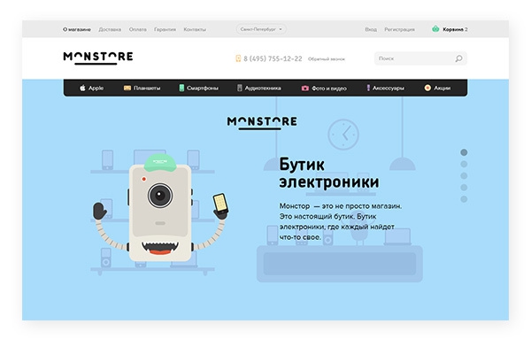 Дизайнеры агентства Breadhead создали логотип, фирменный стиль, сайт и название для онлайн-магазина электроники Monstore. В названии креаторы использовали игру слов Mon и Store, т.е. «Мой магазин».