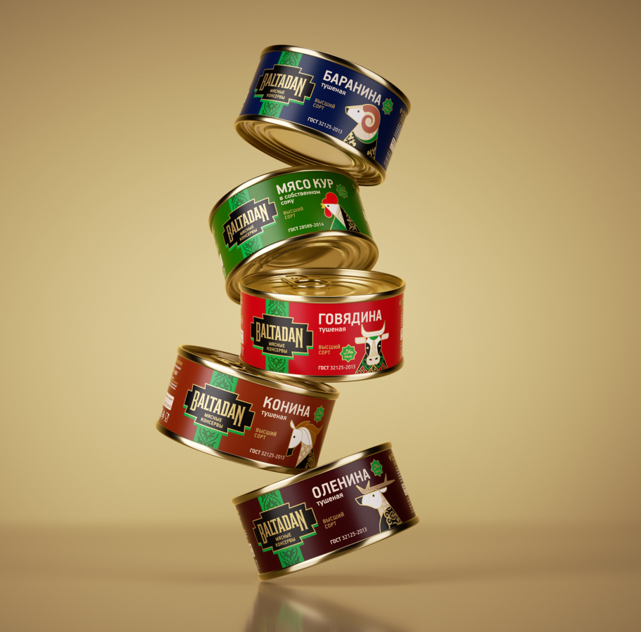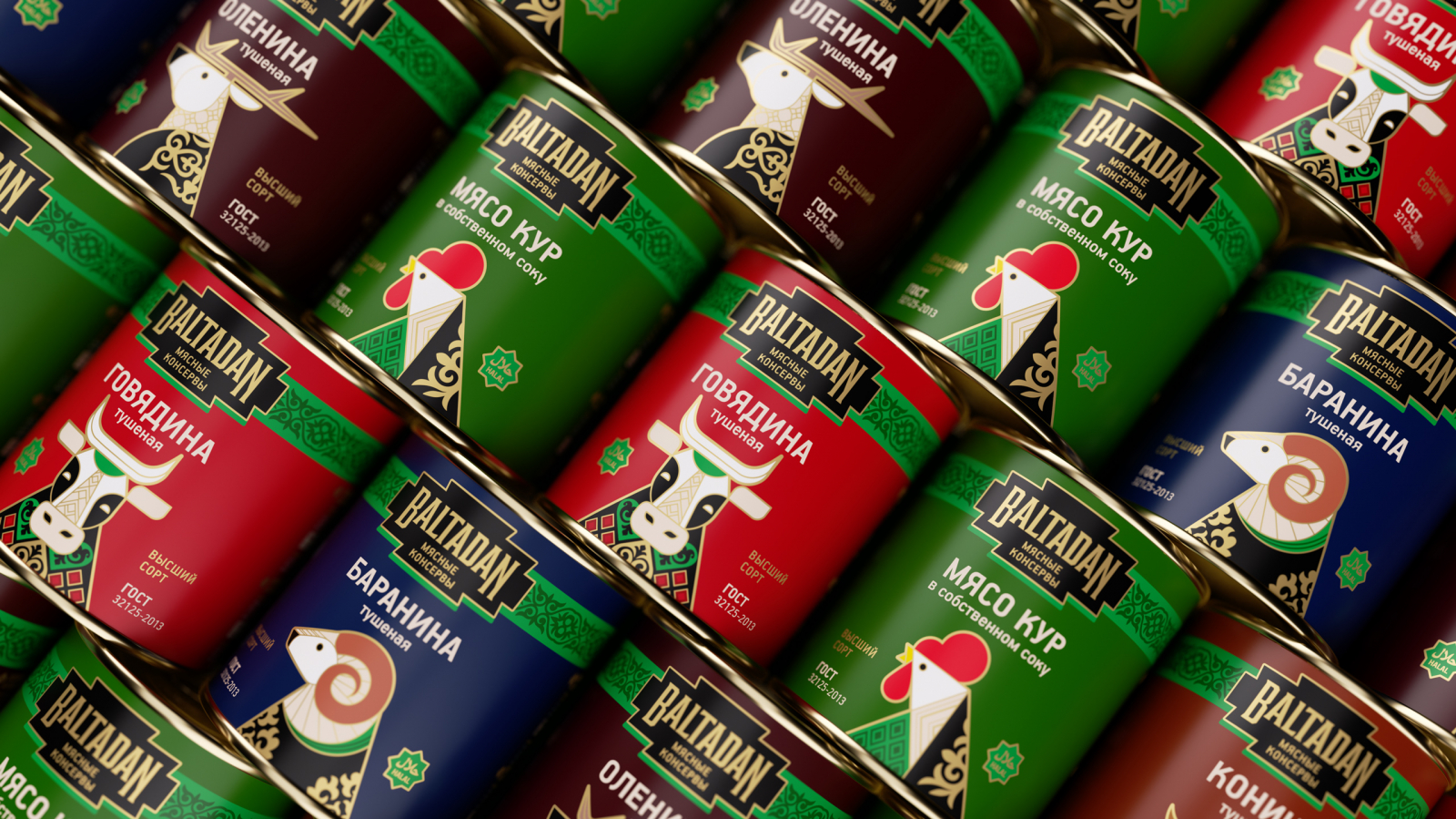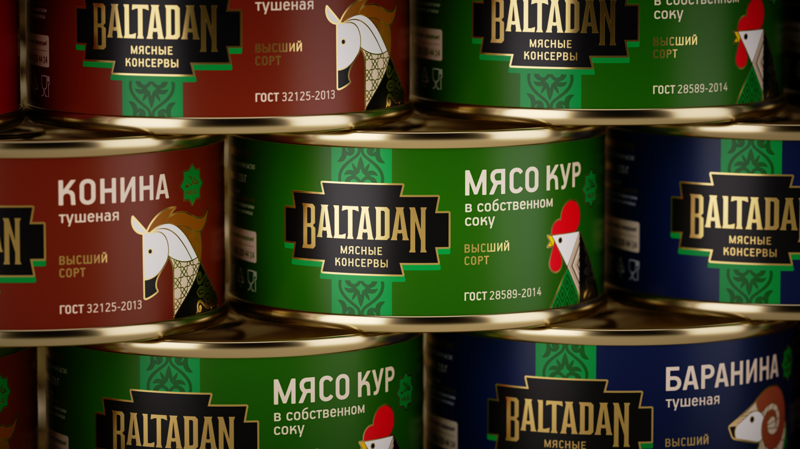 На упаковках консервов часто используют фото реалистичных животных или изображения в гравюрной стилистике, поэтому они похожи между собой. Для брендирования тушёного мяса Baltadan были выбраны минималистичные иллюстрации с геометричными и растительными орнаментами. Такое графическое решение подчёркивает их уникальность. Каждый вкус имеет свой характерный цвет, чтобы легко находить любимый продукт на полке.