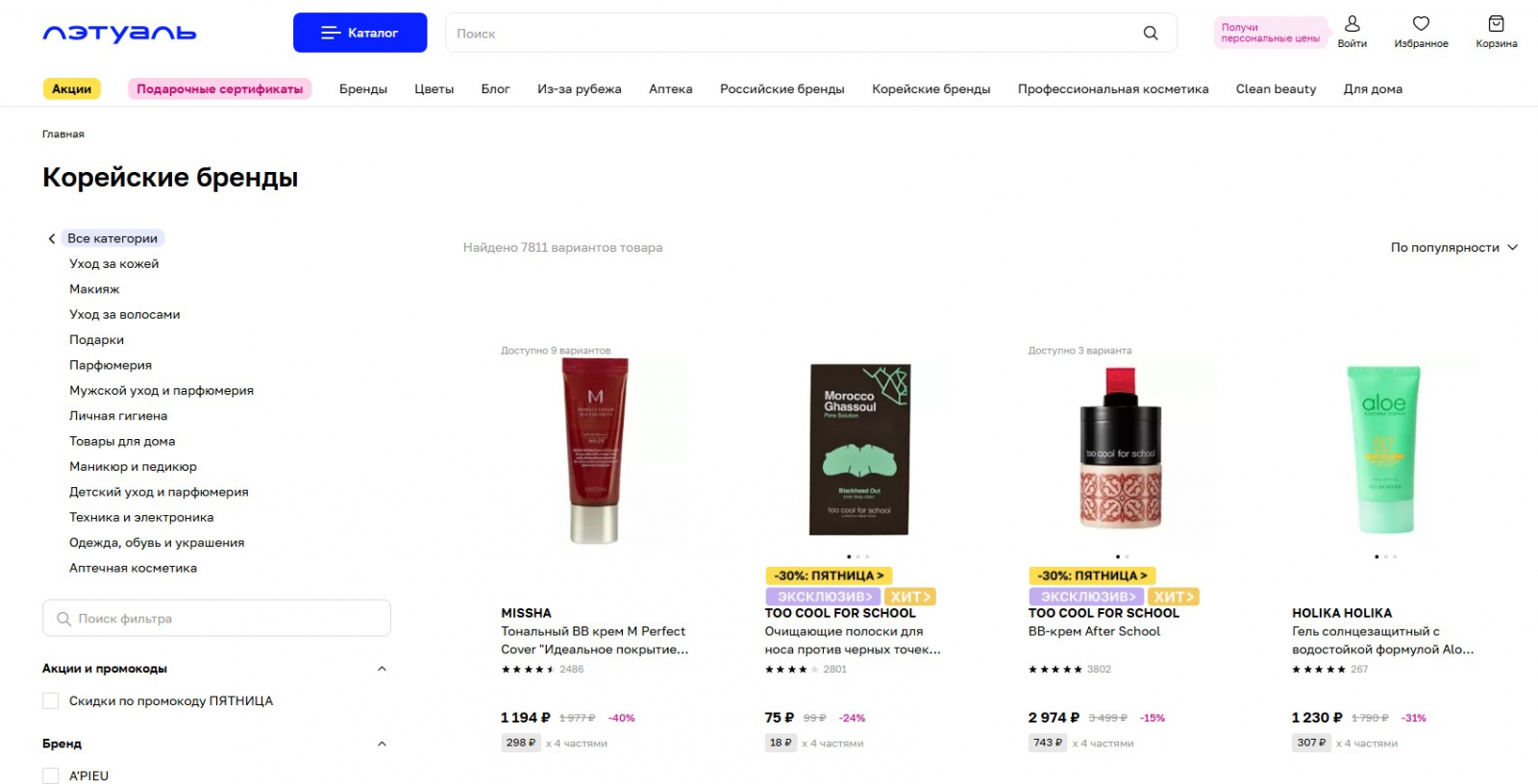 На полках «Золотого яблока» корейская косметика занимает от 25 % до 33 % всего ассортимента косметических средств, соперничая по представленности с крупнейшими западными брендами. В сети «Лэтуаль» также представлен широкий ассортимент корейских брендов (более 180). Спрос растет вслед за количественным увеличением товаров на полках — аналитики компании зафиксировали рост в 40% за 2024 год по сравнению с данными за 2023 год. Даже «ВкусВилл» стал интересоваться продажей корейских уходовых средств, не являясь профильным продавцом товаров этой категории.