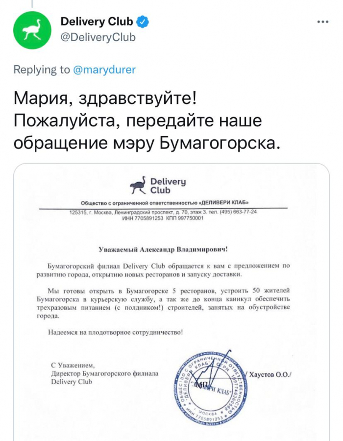 Delivery Club опубликовал обращение, в котором предложил Матвею открыть в Бумагогорске пять ресторанов и устроить на работу курьерами 50 жителей города —