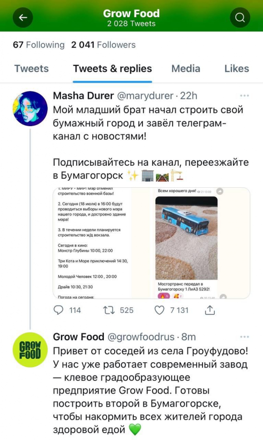 11-летний Матвей из Нижнего Новгорода создал город из бумаги — его старшая сестра завела для проекта Telegram-канал, в котором публикуются главные новости Бумагогорска. Например, в июле состоялись выборы нового мэра, H&M продолжил свою работу, в местном кинотеатре показывали «Бэтмена» с Робертом Паттинсоном, а в больнице удалось быстро вылечить 40 пациентов с COVID-19.