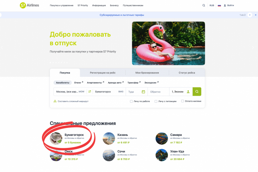Авиакомпания S7 Airlines запустила первый рейс в Бумагогорск — запланировать путешествие можно было на официальном сате перевозчика.