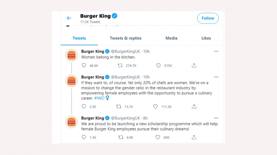 В честь 8 Марта британское подразделение Burger King опубликовало в Twitter тред, который начинался с фразы «место женщин на кухне». В следующем твите шло уточнение: «Только если они сами этого захотят».