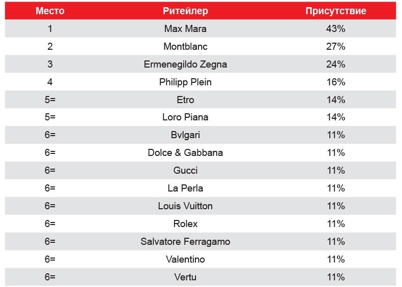 Лидером рейтинга люксовых марок остаётся итальянский модный дом Max Mara: бренд присутствует почти в половине проанализированных городов (43%). В тройку лидеров впервые вошли немецкие аксессуары Montblanc (27%), подвинув итальянскую мужскую одежду Ermenegildo Zegna (24%) на одну строчку вниз. При этом бренд Etro вышел из первой тройки, разместившись на 5-м месте.