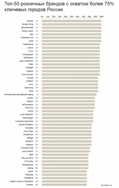 Отечественный ритейл доминирует в рейтинге самых распространённых брендов в России. Сети «Детский мир», Befree, Gloria Jeans, «Спортмастер», kari и Zolla присутствуют во всех ключевых городах страны и, соответственно, делят первую строчку. Из международных брендов только Burger King смог охватить все 100% городов, при этом McDonald’s также вошёл в первую пятёрку, но занял в ней последнее место с показателем покрытия 89%. Такие данные содержатся в исследовании Retail Destination Russia 2019, которое подготовила компания JLL.