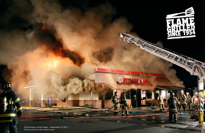 «Бургер Кинг» поджег свои рестораны в новой рекламе. Агентство David Miami подготовило серию рекламных принтов, на которых пожарные тушат горящие рестораны «Бургер Кинг». На постерах изображены настоящие рестораны бренда, охваченные огнем.