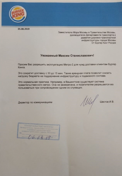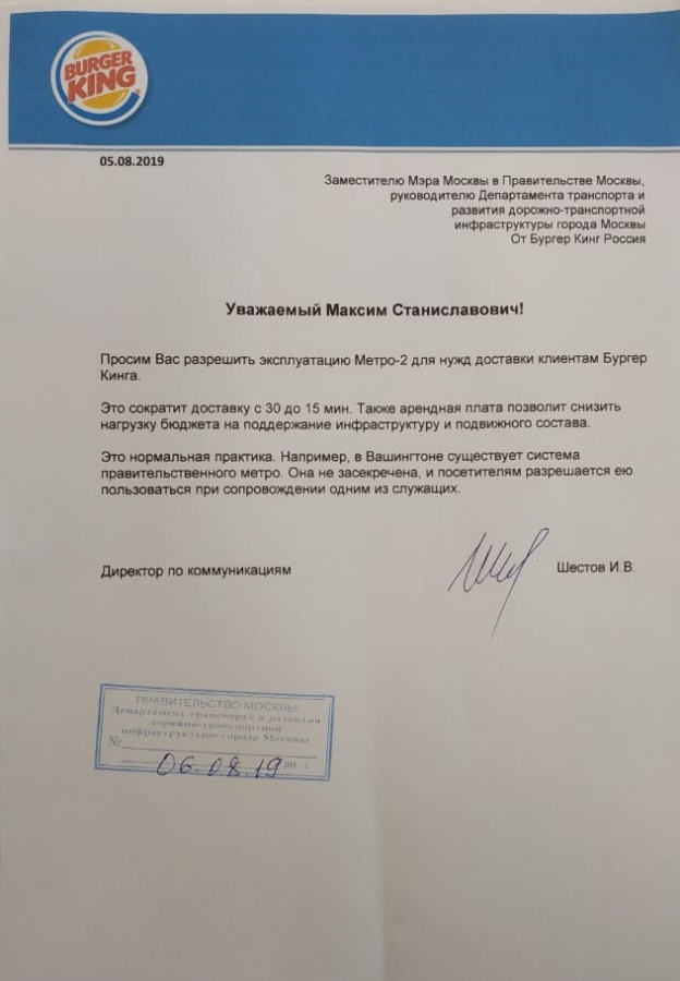 Компания «Бургер Кинг» попросила у правительства Москвы доступ в Метро-2, сообщает пресс-служба ресторанов быстрого питания. Она надеется таким образом ускорить доставку.