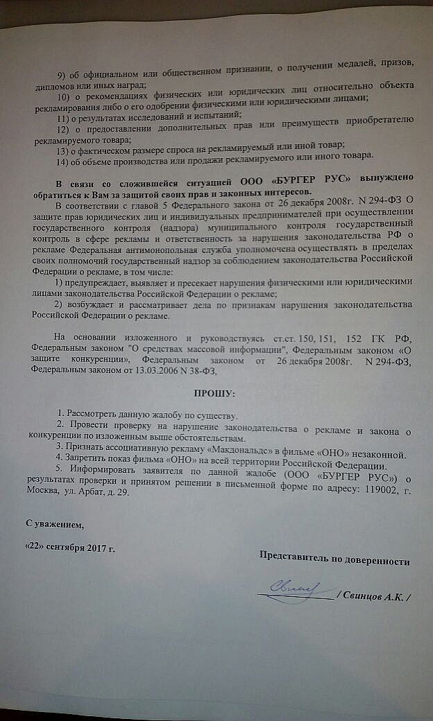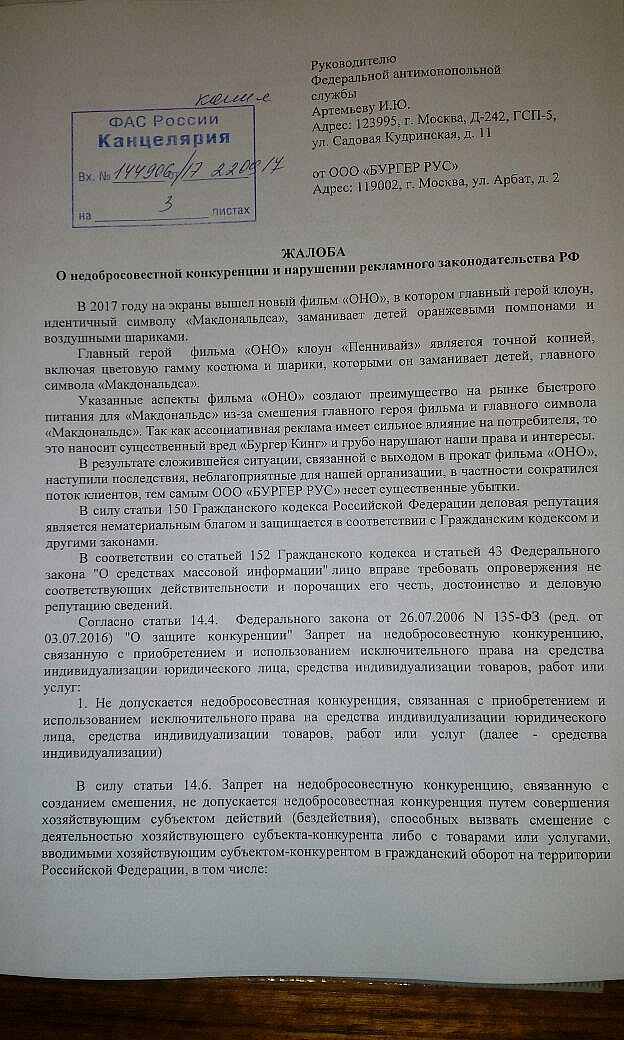 Со ссылкой на нормативно-правовые акты ООО «БУРГЕР РУС» обратились в Федеральную антимонопольную службу за защитой своих прав и законных интересов и с просьбой запретить показ фильма "Оно".