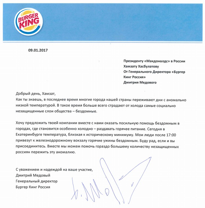 Генеральный Директор компании обратился к президенту «Макдоналдс» в открытом письме. Он обратил внимание на аномально холодную погоду в стране и подчеркнул, что в самой большой опасности в эти дни оказались бездомные. «Бургер Кинг» часто пишет письма в «Макдоналдс». Летом Дмитрий Медовый вызвал Хамзата Хасбулатова на покемон-дуэль, а самый известный пример — предложение создать новый бургер, «МакВоппер».