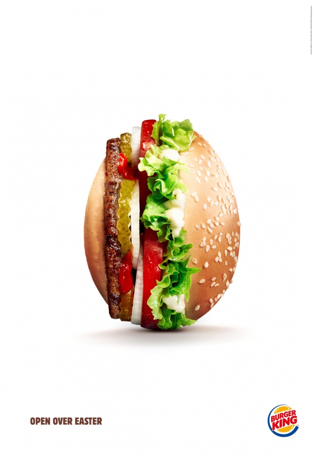 Эта идея транслируется через пасхальные принты, на которых воппер изображен в виде яйца. Все баннеры сопровождаются слоганом «Open over easter» (Открыт всю Пасху).