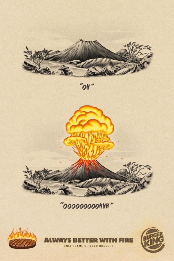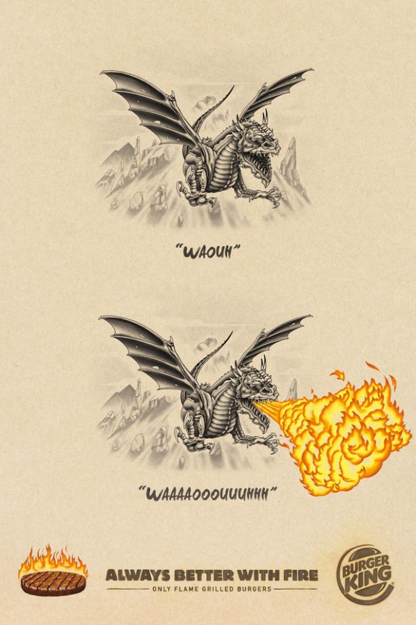 Идея серии принтов «с огоньком» принадлежит агентству Buzzman. Кампания состоит из пяти пар рисунков — в один из рисунков каждой пары добавили немного огня.