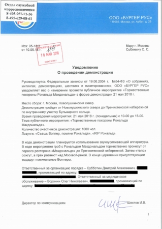 Российское представительство сети «Бургер Кинг» подало заявку в мэрию Москвы на проведение общественных похорон Рональда Макдональда — маскота сети ресторанов «Макдоналдс».