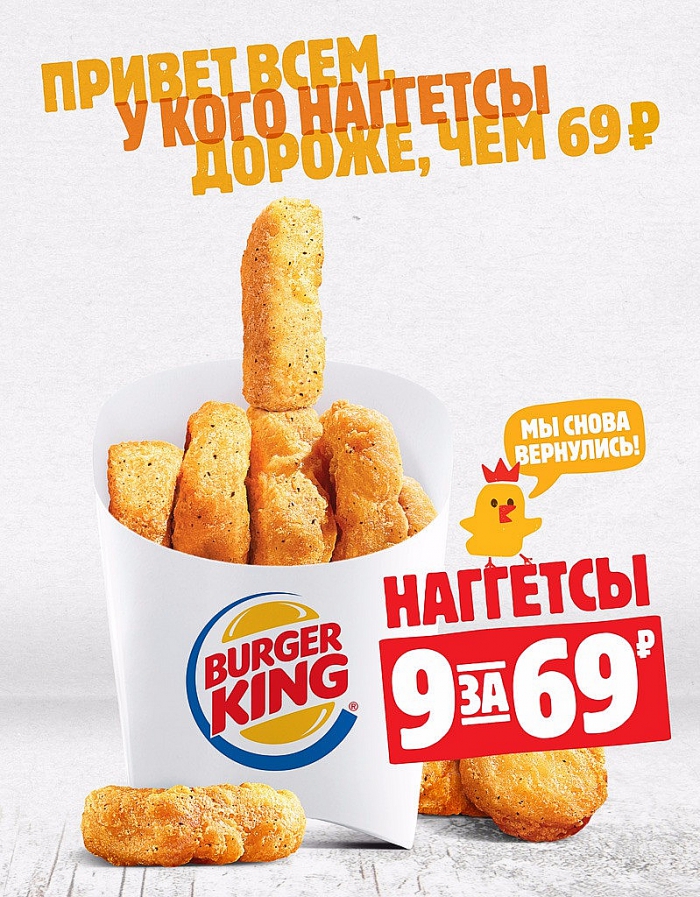Новый баннер создан для акции «Наггетсы за 69». В интернете, социальных сетях и на корпоративном сайте транслируется оригинальная версия, со слоганом «Это тем, у кого наггетсы дороже». В Wi-Fi сети метрополитена реклама более спокойна: «Мы снова их сделали». Изначальный слоган заменили по просьбе оператора wi-fi в столичной подземке «МаксимаТелеком»