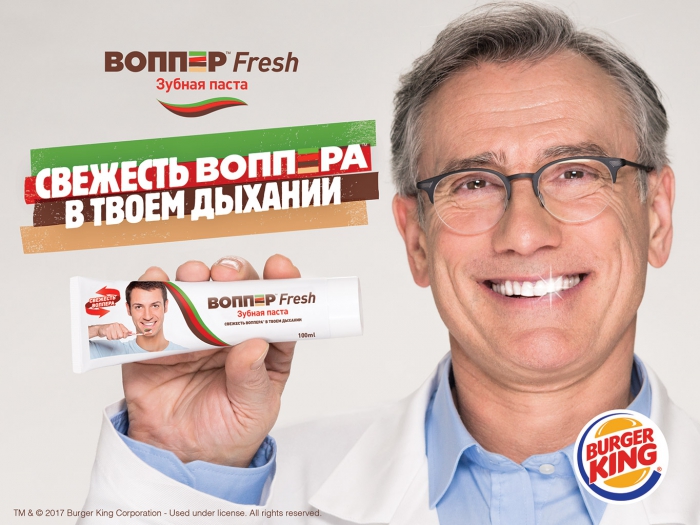 Сеть ресторанов быстрого питания Бургер Кинг давно зарекомендовал себя как мастеров ситуативного маркетинга и скандального пиара. Новая акция сети фаст фуда — очередное тому подтверждение. 31 марта Бургер Кинг объявил о запуске фирменной зубной пасты со вкусом Воппера (основного сэндвича в меню сети), говорится в официальном пресс-релизе компании.