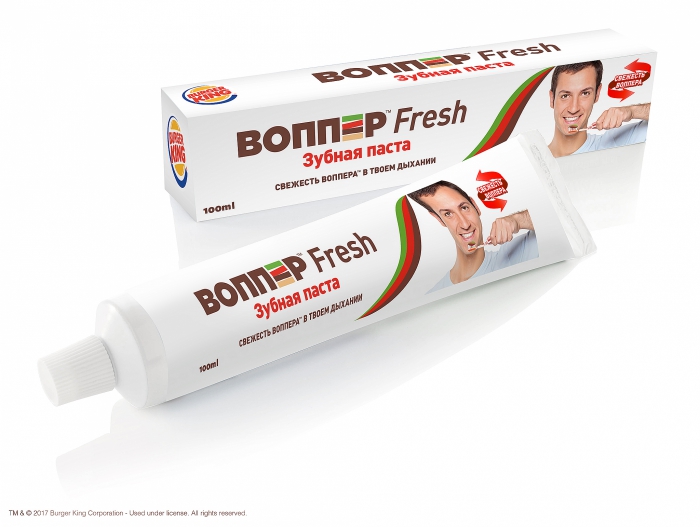 Первая поставка зубной пасты «Воппер Fresh» пришла в ресторан в Москве по адресу ул. Красная Пресня, 4. Представители Бургер Кинга уверяют, что аромат и вкус зубной пасты «Воппер Fresh» напоминают вкус мяса, приготовленного на огне.