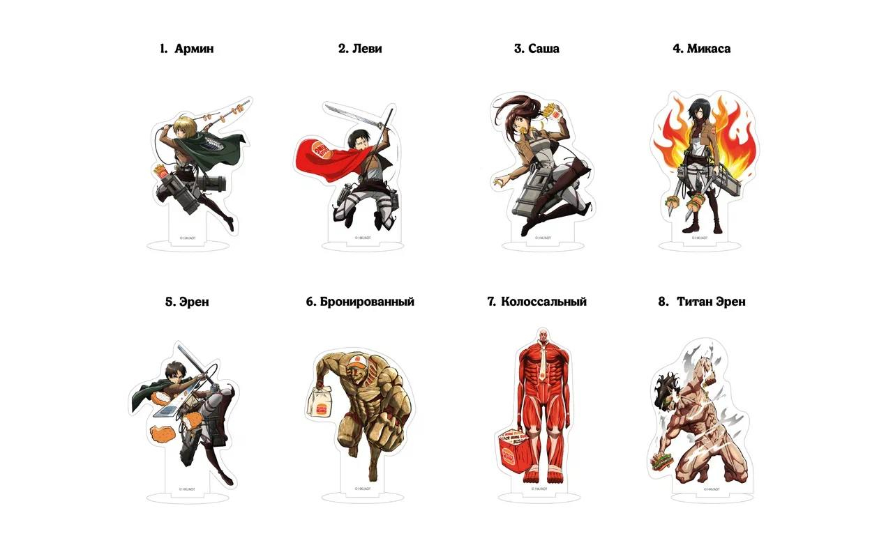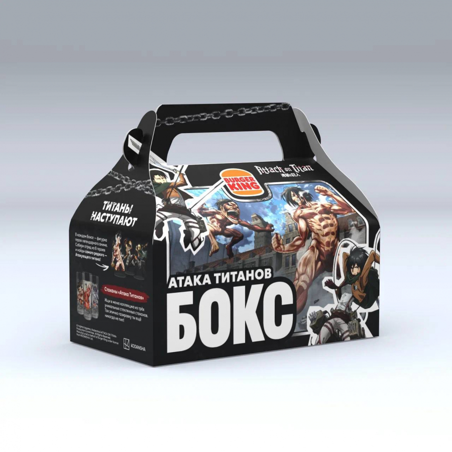 Сеть ресторанов быстрого питания «Бургер Кинг» запускает в России комбо, созданное в коллаборации с аниме «Атака титанов». В бокс войдут титанический воппер, картофель фри, напиток на выбор и одна из восьми акриловых фигурок персонажей: Эрен, Микаса, Леви, Армин, Саша, Бронированный титан, Колоссальный титан или титан Эрен. Об этом Sostav рассказали в пресс-службе «Бургер Кинга».
