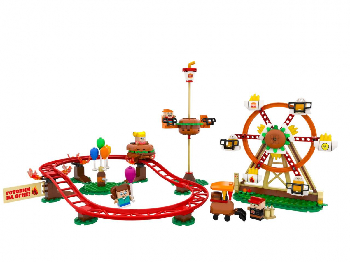 Набор представляет собой масштабный проект для сборки: 356 деталек, из которых можно построить тематический парк с аттракционами, стилизованными под бургеры, картошку фри и другие блюда.