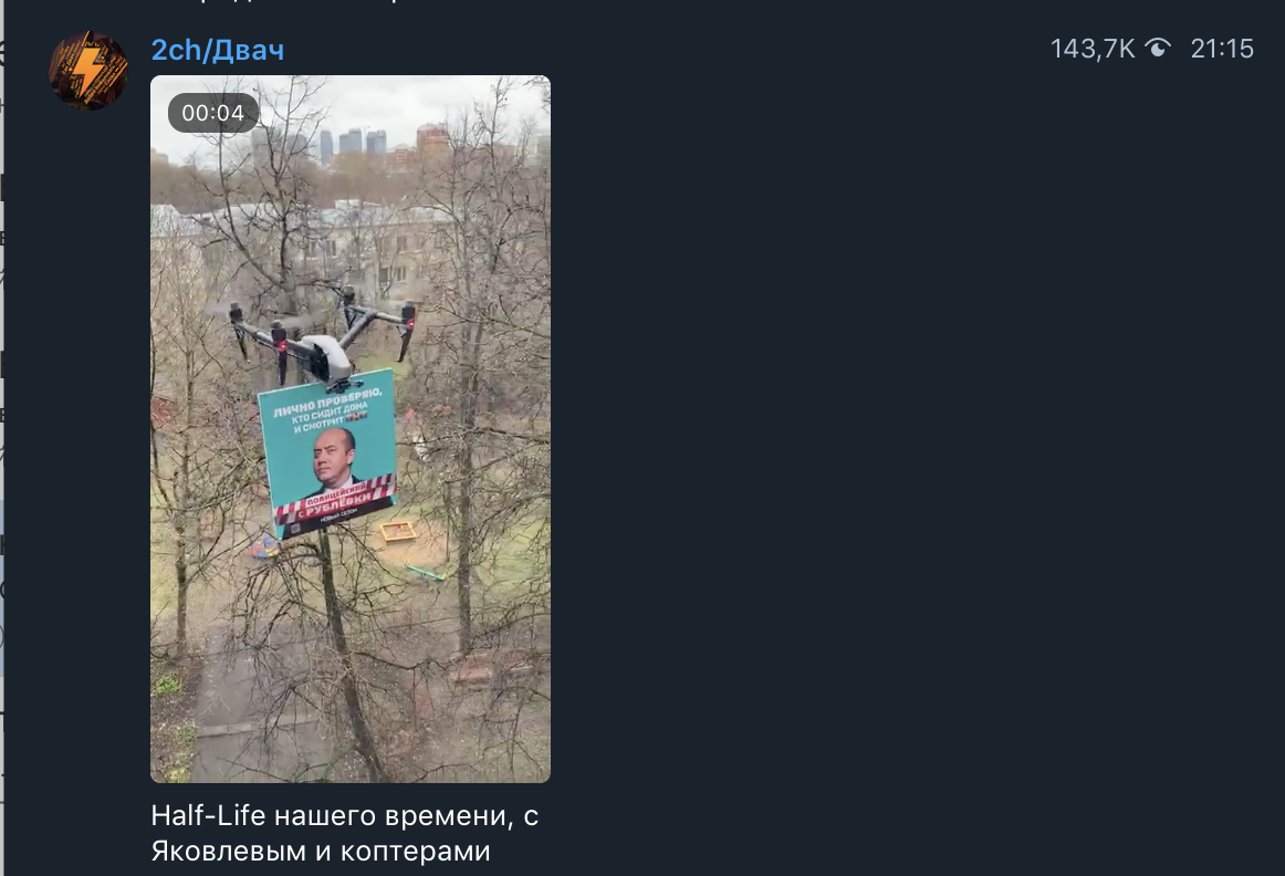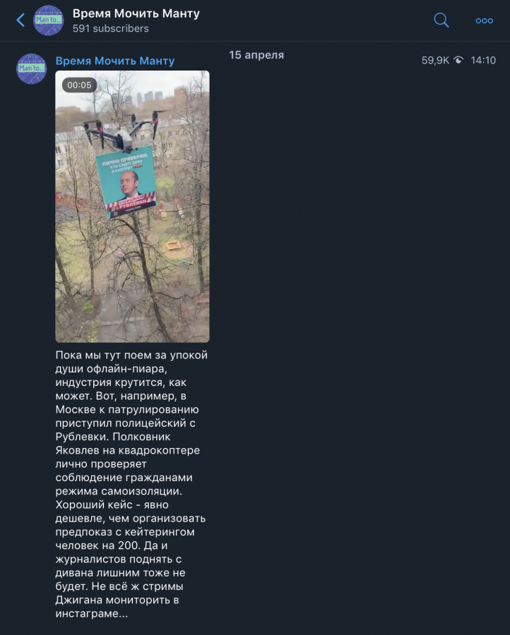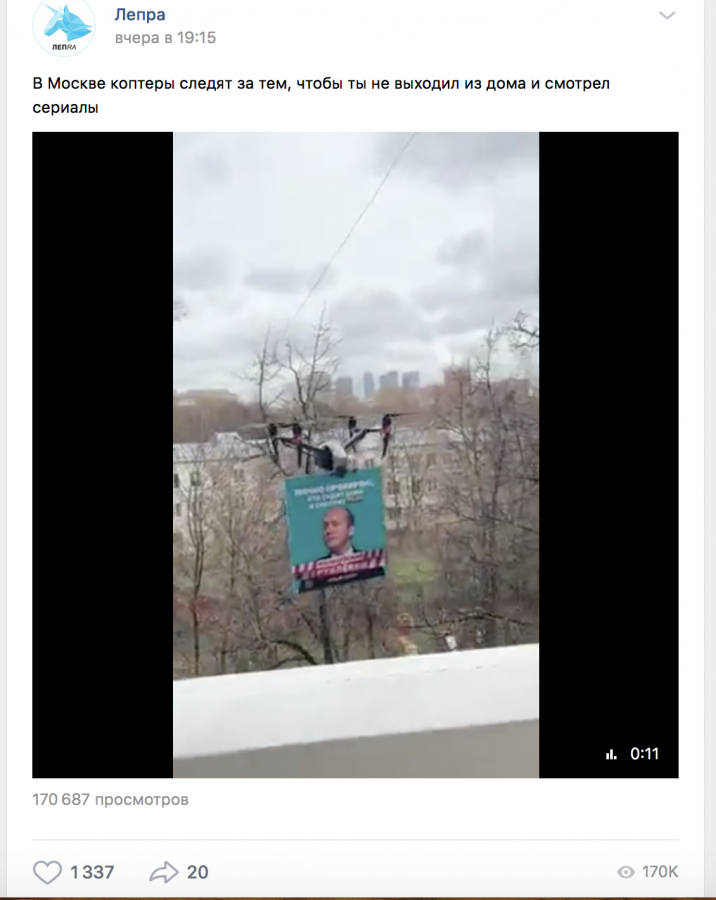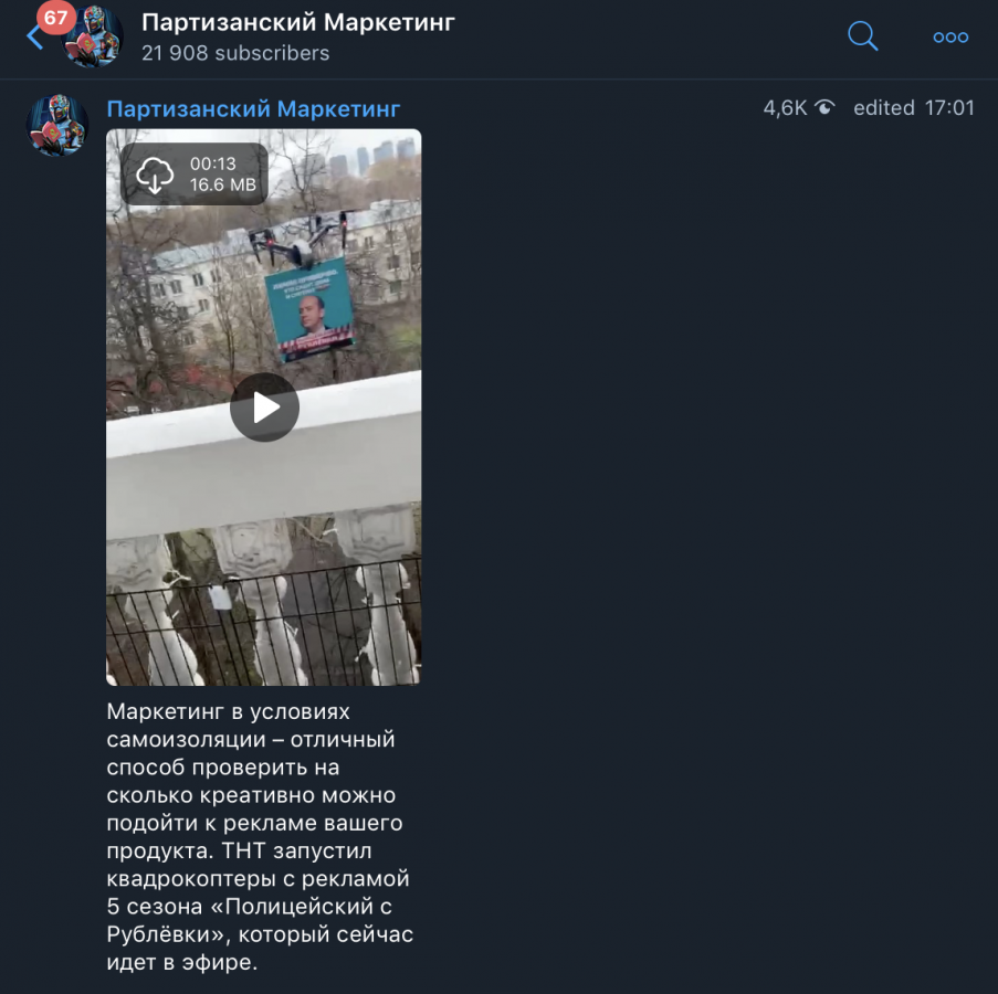 Квадрокоптер с портретом главного героя сериала «Полицейский с Рублевки» полковника Яковлева пролетел по Москве. Надпись на плакате гласила: «Лично проверяю, кто сидит дома и смотрит ТНТ».