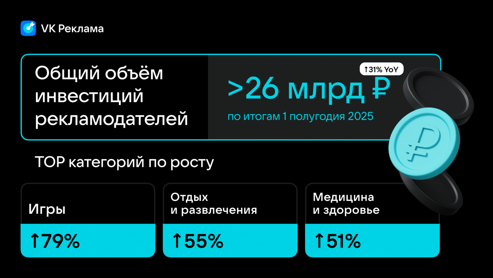По итогам первого полугодия общий объем инвестиций рекламодателей в продвижение в «VK Рекламе» увеличился на 31% в годовом выражении, превысив 26 млрд руб. Среди растущих категорий: игры (рост на 79%), отдых и развлечения (плюс 55%), медицина и здоровье (плюс 51%), e-commerce (плюс 46,8%).