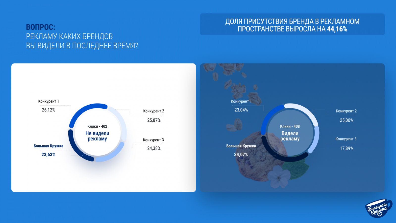 Рекламная кампания усилила позиций бренда среди конкурентов. На это указывает рост присутствия в рекламном пространстве на 44,1%.