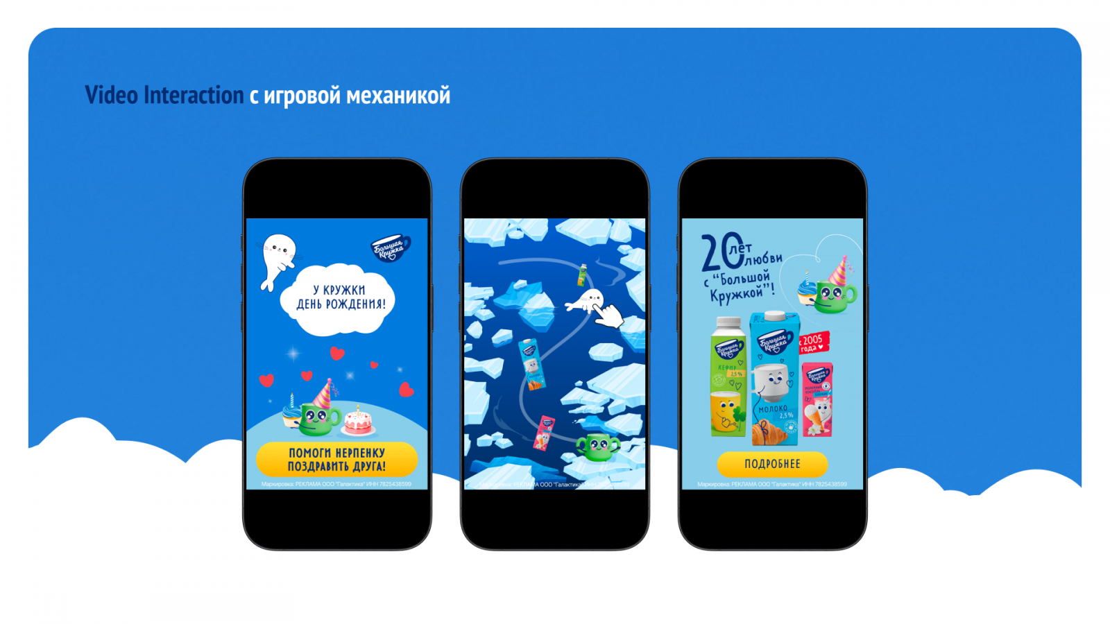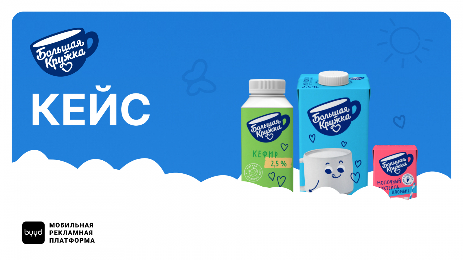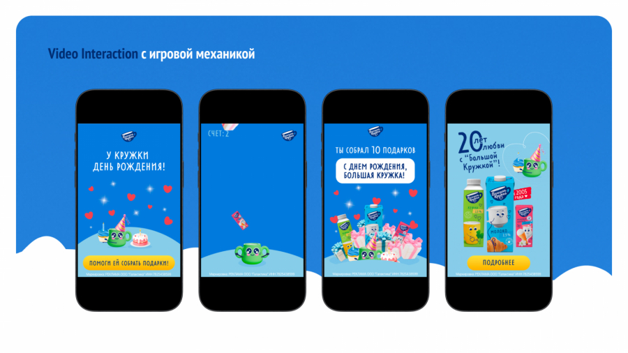 Для рекламной кампании бренда «Большая Кружка» команда BYYD разработала два баннера Video Interaction с игровой механикой и слоганом «20 лет любви с “Большой Кружкой”». Пользователю предлагалось пройти мини-игру, а затем по кнопке «Подробнее» посмотреть теплый видеоролик с молочной продукцией бренда и поздравлениями в честь юбилея существования на рынке.