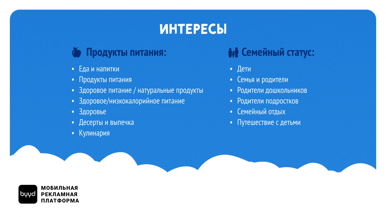 - Семейный статус: аудитория, которая активно заботится о питании детей, планирует совместные активности и путешествия.
