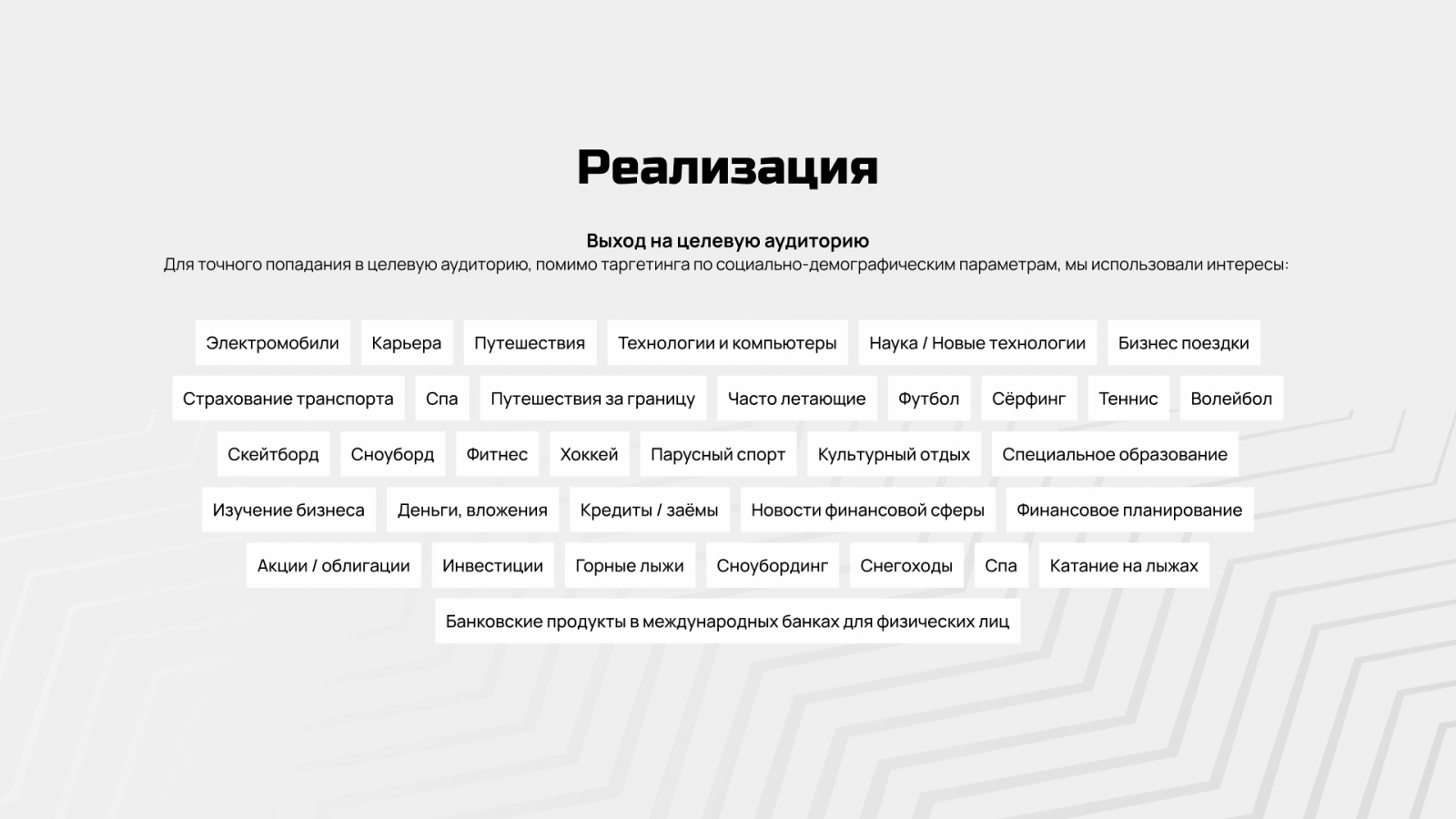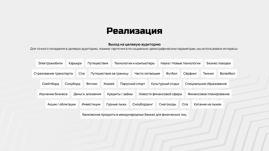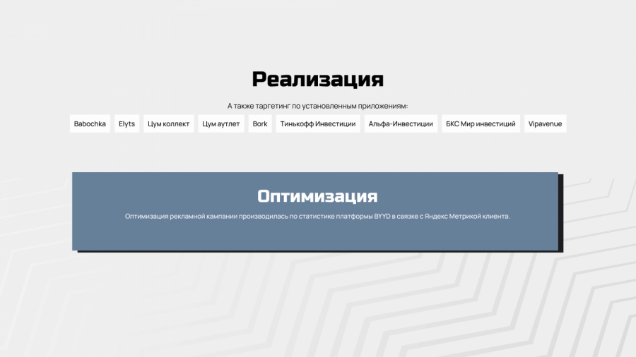 Дополнительно применялся app-based targeting, позволивший выделить пользователей, уже взаимодействующих с релевантными категориями мобильных приложений — такими как Babochka, Elyts, «Цум коллект», «Цум аутлет», Bork, «Тинькофф Инвестиции», «Альфа Инвестиции», «БКС Мир инвестиций», Vipavenue.
