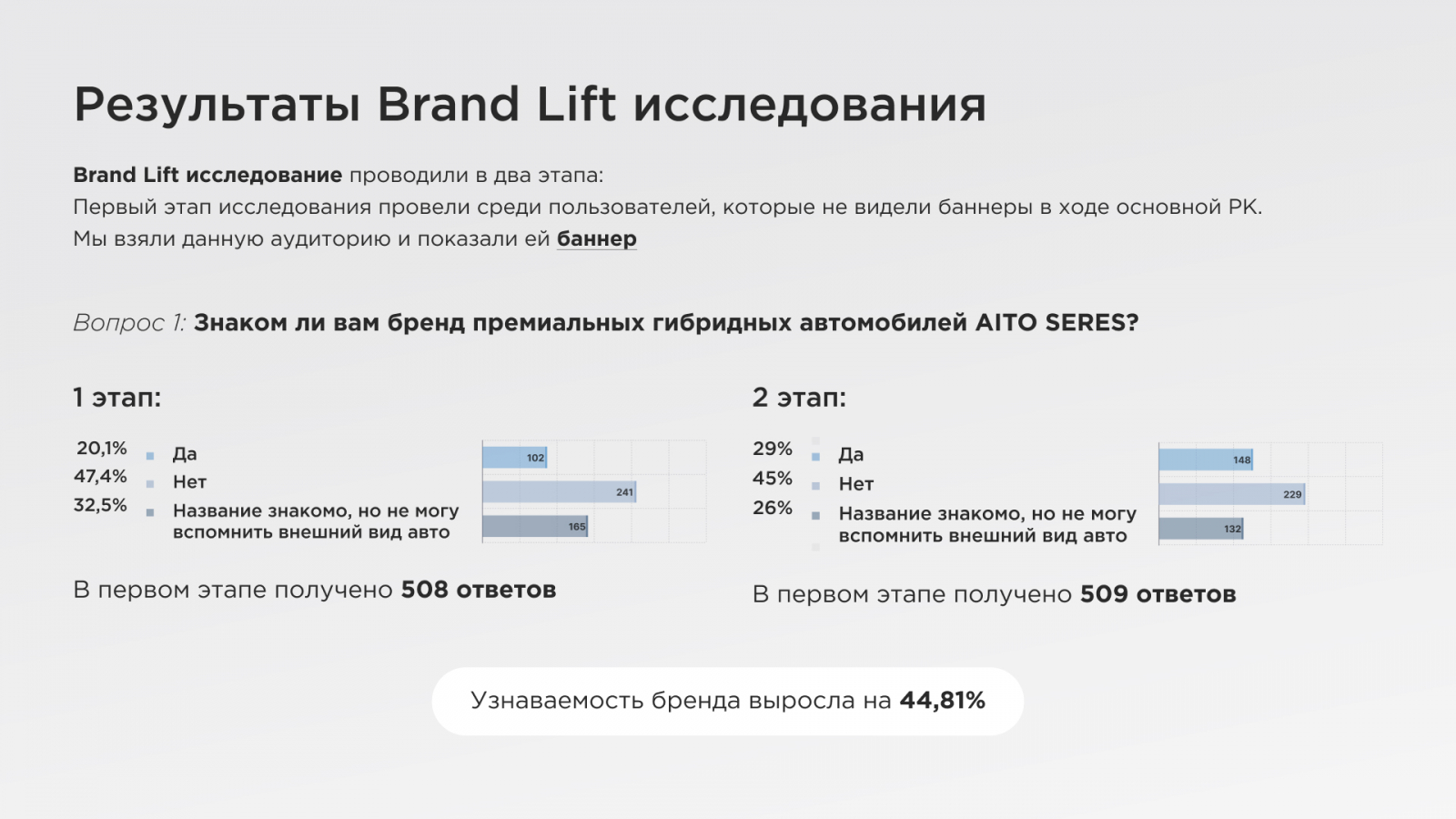 Удалось выяснить, что узнаваемость бренда выросла на 44,81%.