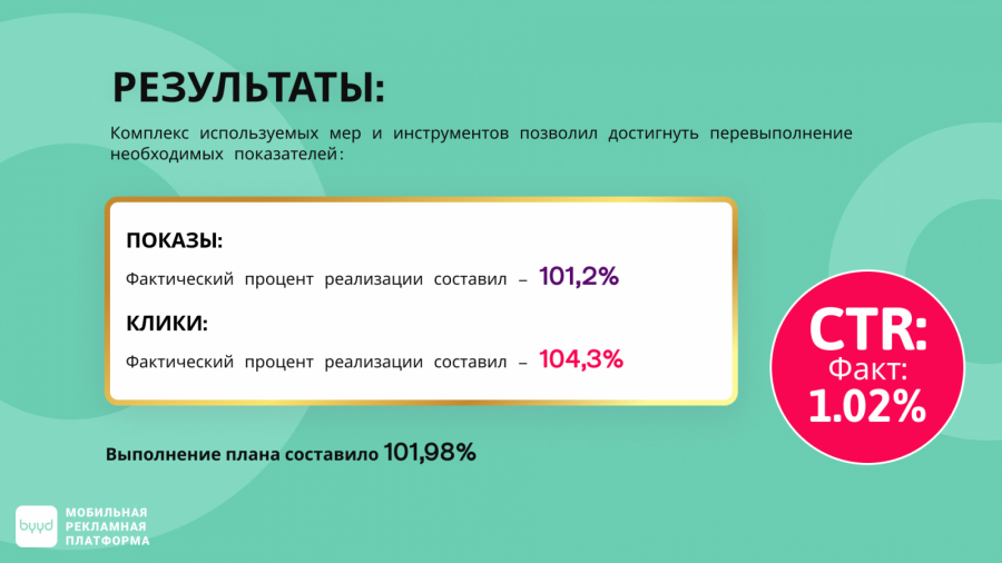 Благодаря правильному таргетингу, видеокреативу и комплексной оптимизации удалось превзойти плановые показатели и получить: