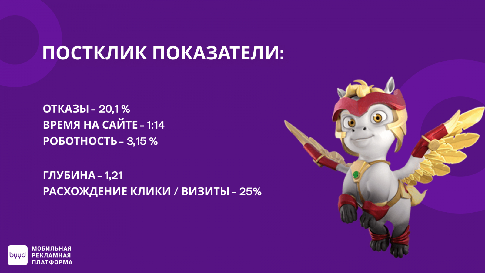 Постклик показатели также подтвердили успешность кампании. Например, фактический низкий процент отказов составил всего 20,1%, а время нахождения на сайте составило 2 мин. 30 сек. Это свидетельствует о высокой релевантности контента для целевой аудитории и глубоком вовлечении пользователей в представленный контент и продукцию бренда.