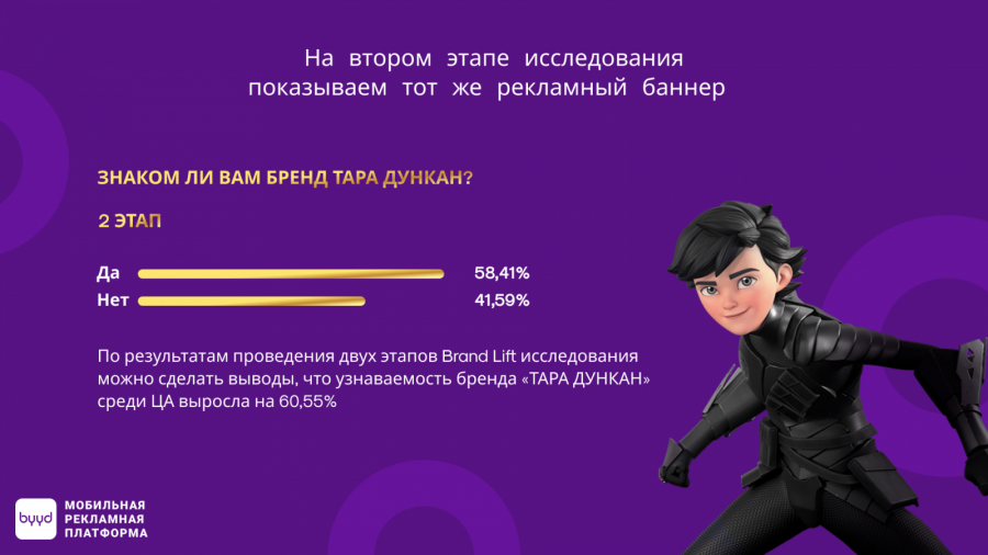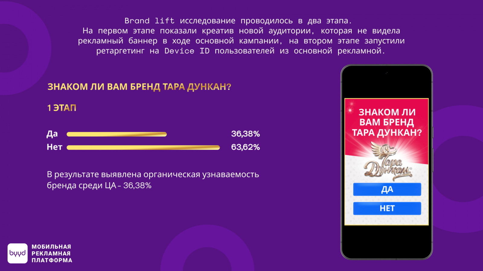 Одним из методов для оценки успешности кампании является исследование Brand Lift, которое помогает измерить уровень узнаваемости бренда до и после мобильной кампании. Это исследование было проведено для бренда «Тара Дункан» и включало два ключевых этапа.