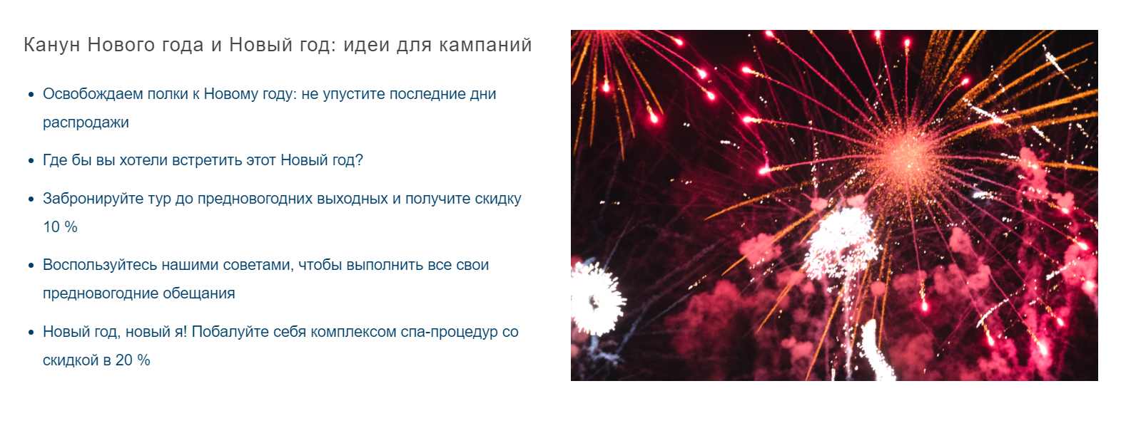Генератор предлагает идеи кампаний, статистику и справочные ресурсы. Для его использования нужно выбрать тип бизнеса из списка и время запуска кампании — праздник либо сезон, например, летних распродаж или простудных заболеваний. Также можно выбрать кампанию, которая будет актуальна весь год.