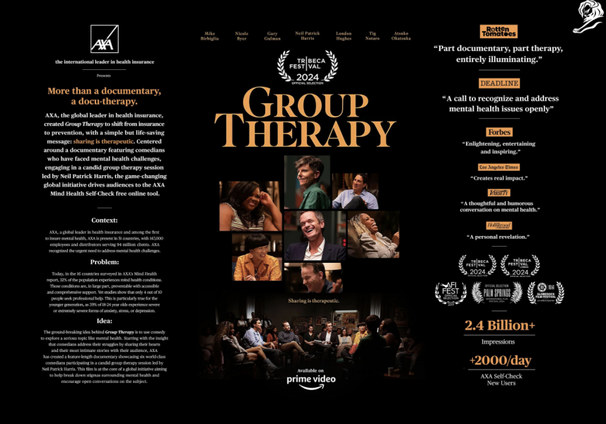 AXA использовала силу юмора, чтобы говорить о ментальном здоровье не с позиции дидактики, а через близкую и искреннюю форму — групповую терапию с участием известных комиков. В центре кампании короткометражный фильм, где Нил Патрик Харрис и другие комики делятся своими личными переживаниями в терапевтической обстановке. Это не скетч и не стендап, это формат, в котором юмор служит мостом к уязвимости. Идея «sharing is therapeutic» делает ментальное здоровье обсуждаемым, а не табуированным.