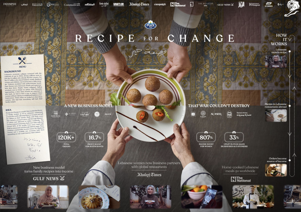 Идея «Recipe for Change» родилась из вопроса: если у женщин больше нет ничего, кроме рецептов, можно ли сделать их экономически значимыми? Puck создал B2B2C-модель, в которой рестораны готовят блюда по рецептам матерей, делясь выручкой, а клиенты получают не просто еду, а способ помочь напрямую.