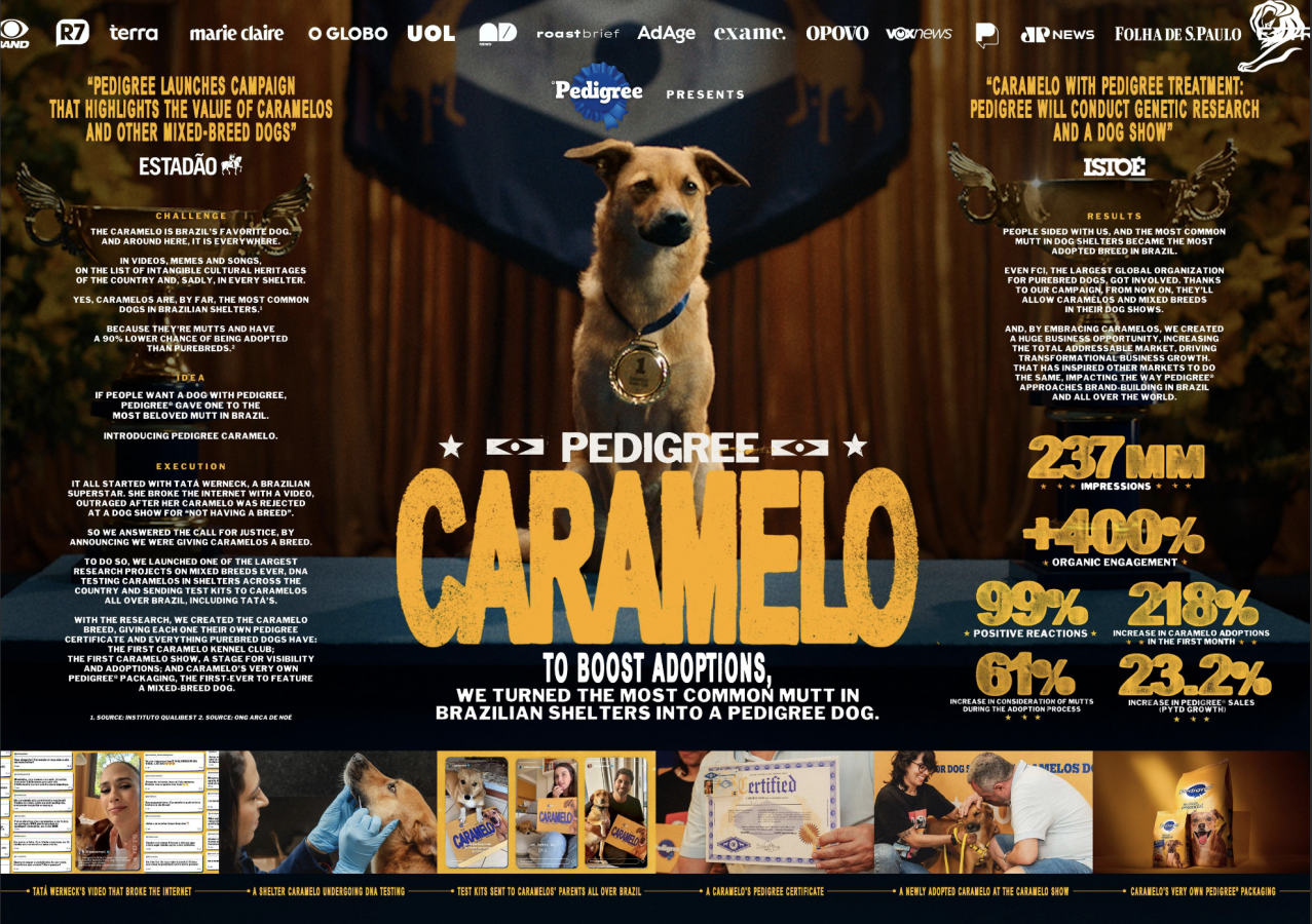 В Бразилии существует обожаемый всеми дворовый пес по имени Caramelo, символ местных беспородных собак. Чтобы разрушить предвзятость в пользу чистокровных пород, Pedigree не стал умолять «заберите дворнягу», а создал новую официальную породу Caramelo. Были разработаны документы, открыт свой Kennel Club и даже проведено шоу, где Caramelo выступили как полноправные участники. Это не только вызвало культурный резонанс, но и сдвинуло восприятие на уровне общества.