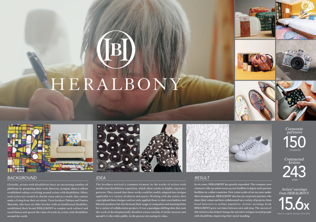 Heralbony разрушает стигму вокруг художников с интеллектуальными особенностями, превращая их уникальный визуальный язык в премиальный дизайн. Вместо того чтобы подавать искусство как благотворительность, бренд продает его как высокую эстетику, которую хочется купить не из побуждений, а из любви к форме. Основа подхода — репетитивные паттерны, свойственные этим художникам, трансформирующиеся в принты для галстуков, рубашек, упаковки и других товаров.