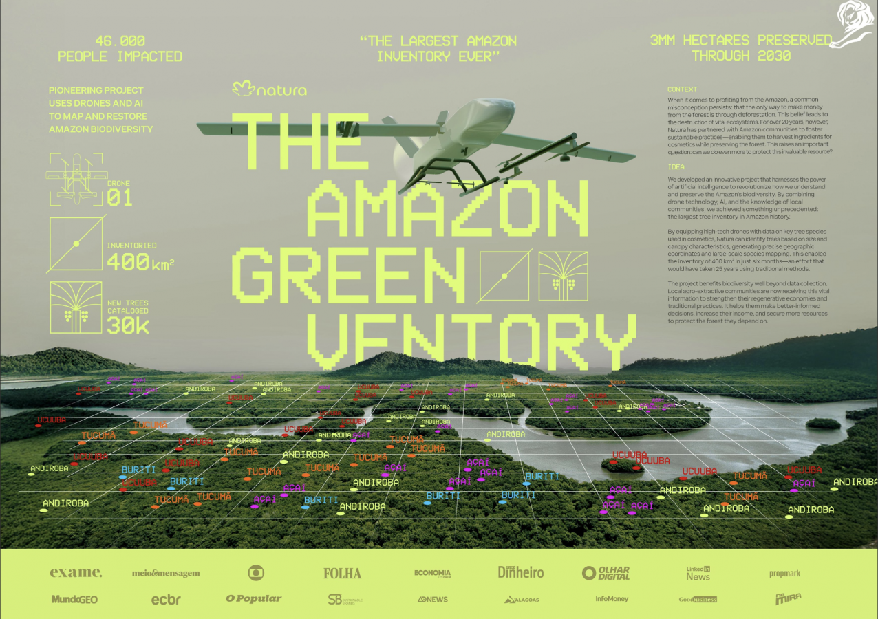 Natura доказала, что сохранить лес выгоднее, чем его уничтожить. Вместе с местными сообществами и при помощи ИИ и дронов бренд провел крупнейшую инвентаризацию деревьев в истории Амазонии, за полгода оцифровав 400 км² — то, что раньше заняло бы 25 лет. Кампания строится на простом, но мощном инсайте: вырубка кажется прибыльной только потому, что мы недостаточно знаем лес.