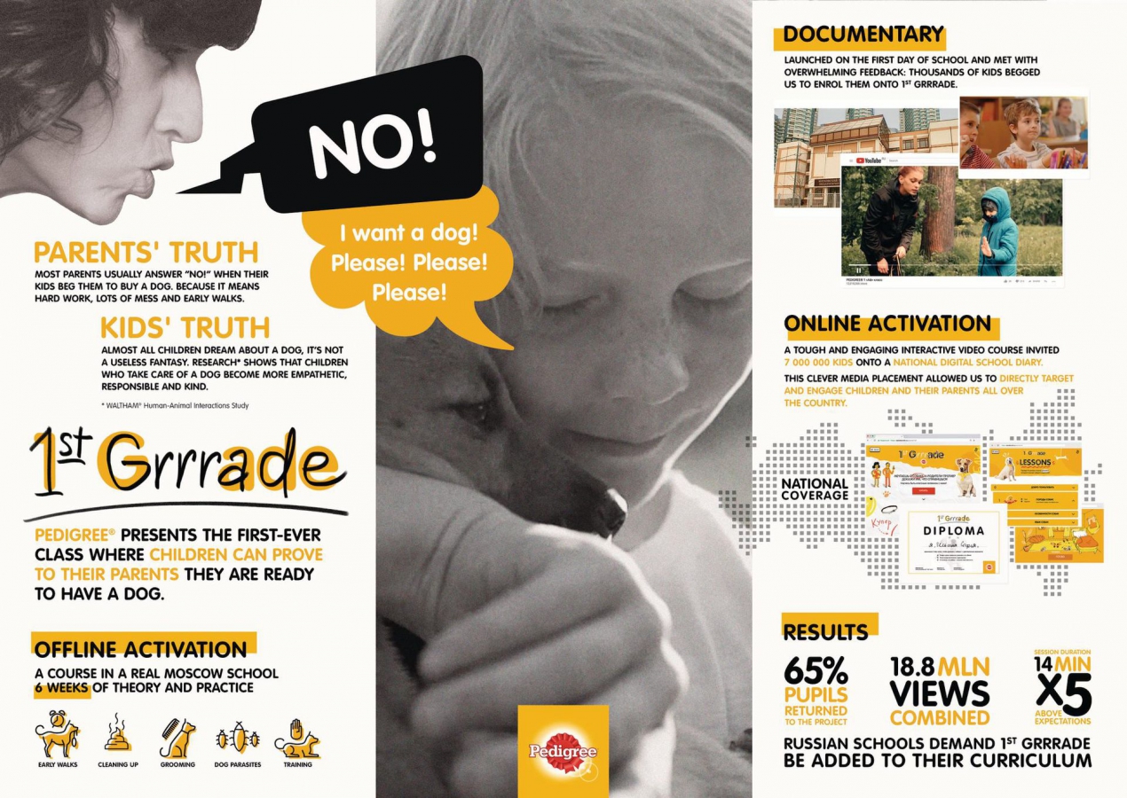 Кампанию «1 «Аф» класс» запустил бренд Pedigree. Его героями стали дети, желающие «завести собачку». Участие в проекте позволило им доказать родителям, что это не каприз, а осознанное решение. Кампания включала специальный обучающий курс, онлайн-курс и документальный фильм. Обучение теории и практике длилось шесть недель.