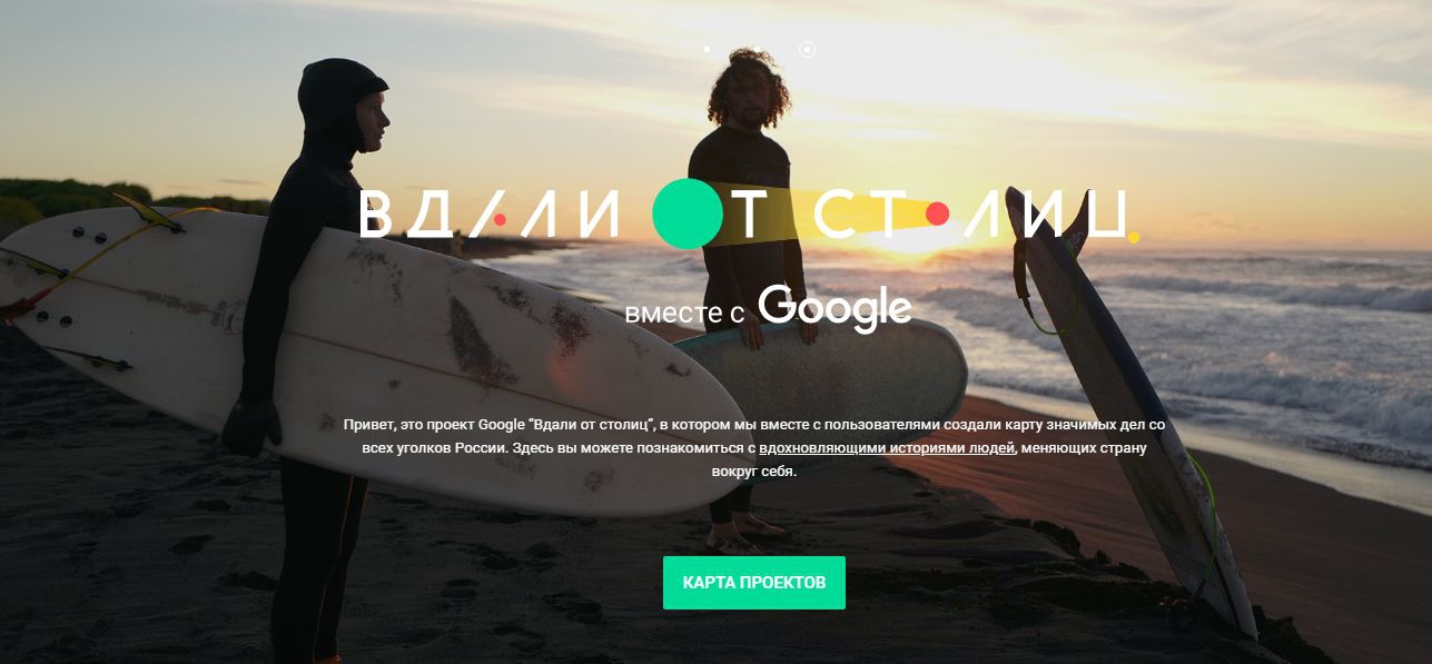Проект Google «Вдали от столиц», в котором поисковик вместе с пользователями создал карту значимых дел со всех уголков России. На карте были собраны вдохновляющие истории людей, которые меняют страну вокруг себя. Победителями стали семь участников, за которых в поиске Google проголосовало больше всего жителей России. Над проектом работали Ketchum Maslov (entrant company, pr) и SLAVA (idea creation).