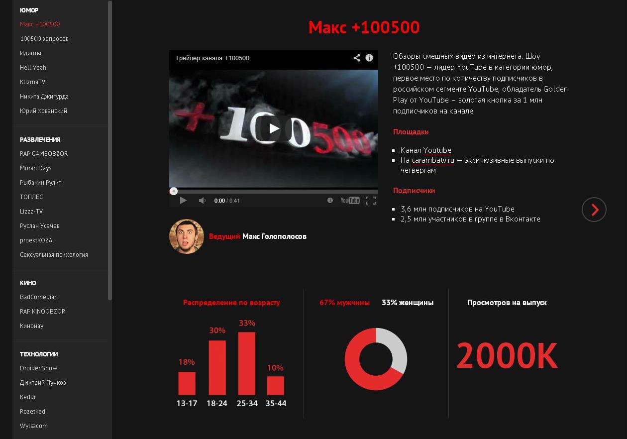 На данный момент в YouTube-каталоге Caramba Media 37 авторов, которые уже имеют большое число подписчиков и охват. Планируется более 50 авторов и расширение тематических категорий – в ближайшее время добавятся рубрики авто и фитнес. По словам г-на Зельцера, самыми востребованными категориями являются юмор, технологии и бьюти, так как женский трафик на YouTube дефицитный.