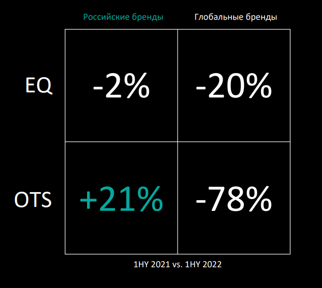 Падение наблюдалось и у российских брендов — в среднем они «просели» на 3 п.п. Это связано с тем, что в наиболее высокие позиции в рейтинге любви и доверия потребителей среди отечественных компаний занимали банковские структуры и телеком-операторы. Они не ушли из региона, но вводили ограничения на выдачу валюты, ограничения и наценки на движение денежных средств, отменяли безлимитные тарифы на интернет, повышали цены.